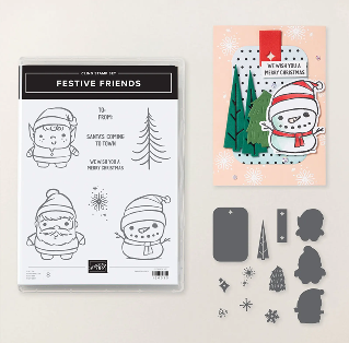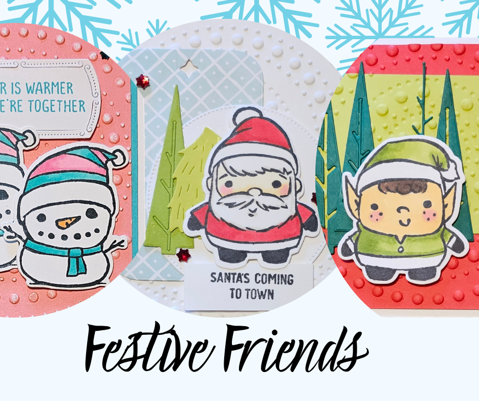 How great is it when you can find a stamp set that you can use for the Holidays and any occasion? Let me introduce you to the Festive Friends Bundle. A Jolly Santa, a cute Elf and adorable snowman all in one package!